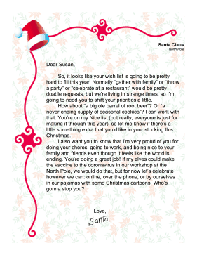 Give adults some encouragement and holiday cheer during the pandemic with this printable letter from Santa about celebration in the time of the coronavirus.