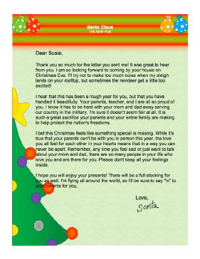 This printable letter from Santa Claus brings warm holiday wishes to a child whose parents are away from home in the military.